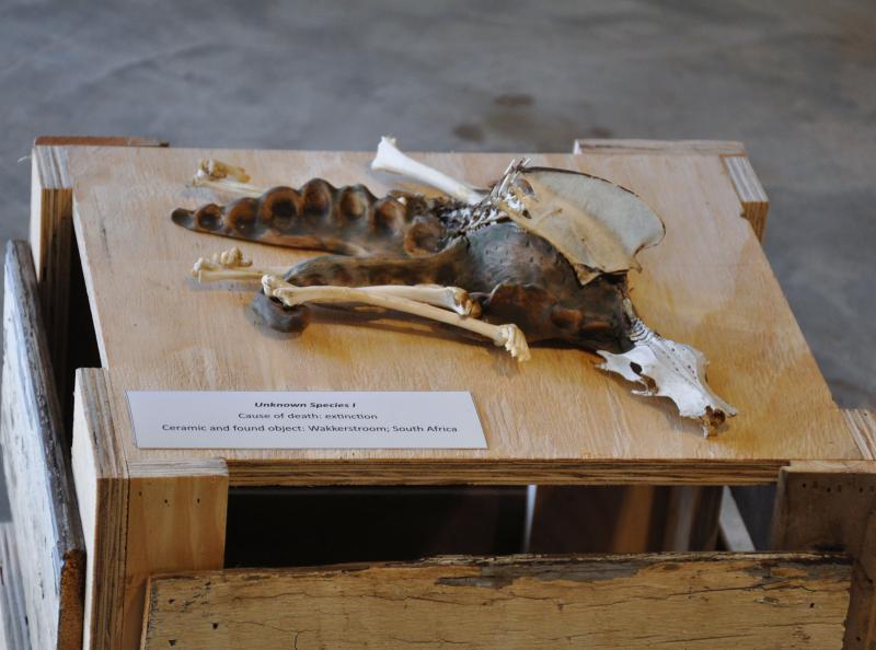 - Reclining Hominid made from ceramic and bone from dead cow.